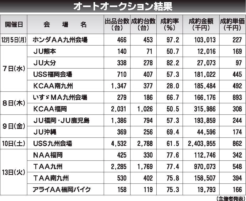 〈オートオークション結果〉九州地区 2022/12/5~13