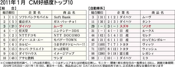 CM総合研究所(関根建男代表)がまとめた1月のCM好感度ランキングによると、総合1位はソフトバンクモバイル「ソフトバンク」で変わらず、2位は東京ガス「ガス・パッ・チョ!」、3位はダイハツ工業「ムーヴ」という結果となった。自動車業類は、ムー...