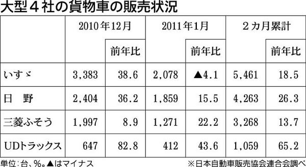 国土交通省による環境対応ディーゼル車の購入支援を受け、国内のトラック市場が堅調に推移している。制度導入以降の2カ月間の累計販売は、大型4社全てが前年比プラスとなった。「昨年のエコカー補助金ほどの勢いはないが、追い風にはなっている」(いすゞ...