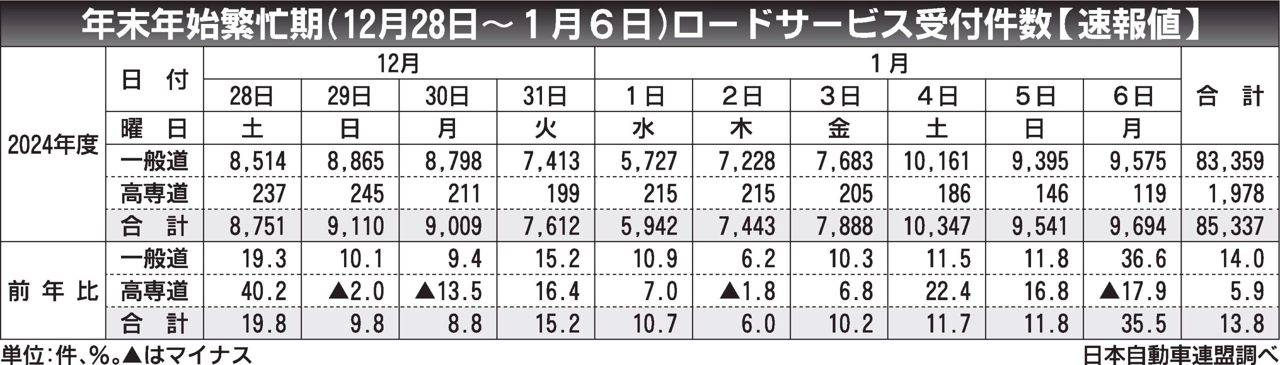 日本自動車連盟(JAF、坂口正芳会長)が全国で受け付けた年末年始(2024年12月28日~25年1月6日)のロードサービス件数(速報値)は前年比13.8%増の8万5337件だった。日本海側で大雪や吹雪が続き、道路環境が悪化したことなどが影...