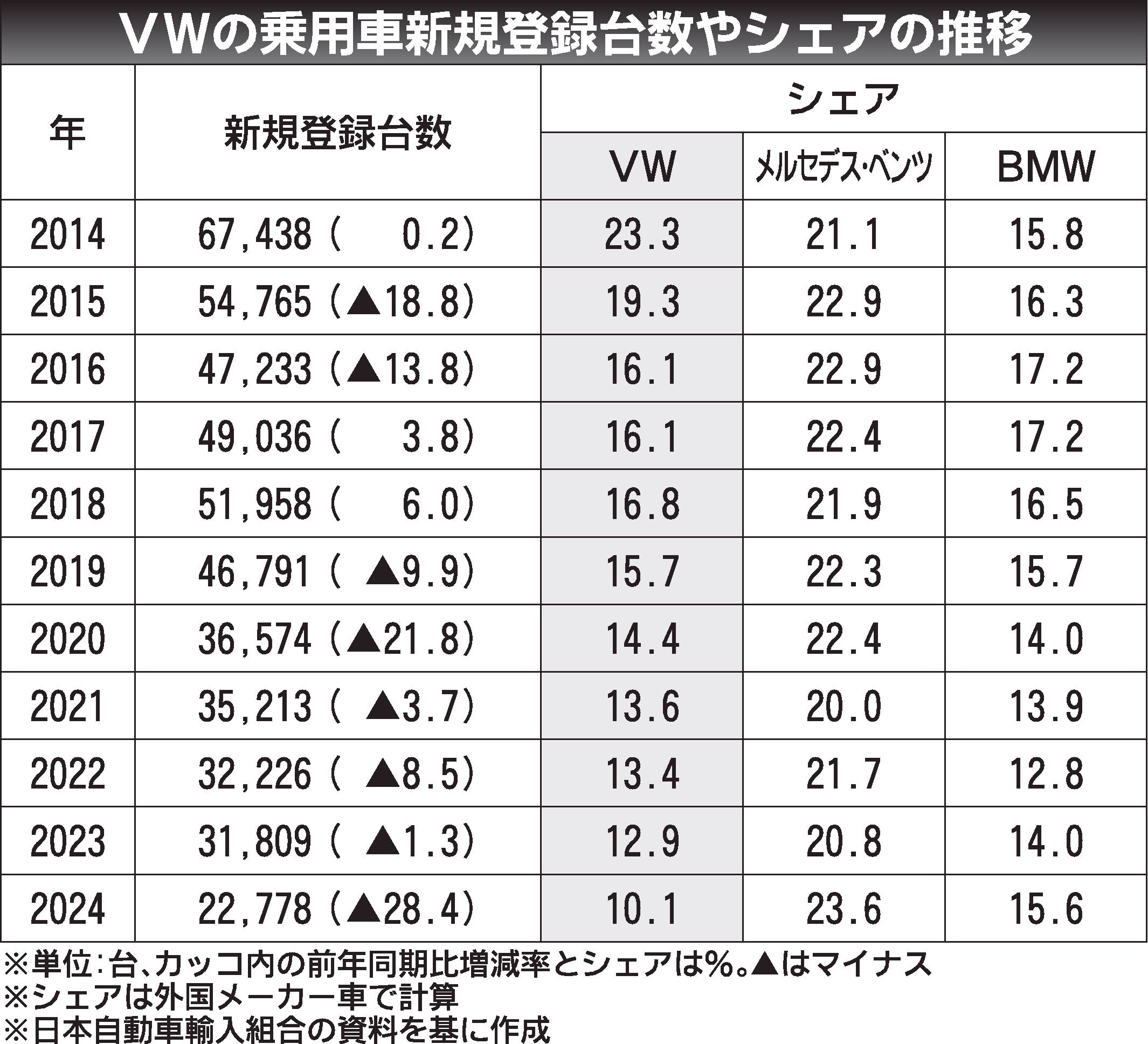 フォルクスワーゲン(VW)車の2024年の国内販売台数が、30年ぶりに3万台を割り込んだ。フォルクスワーゲングループジャパン(VGJ、マティアス・シェーパース社長、愛知県豊橋市)は昨秋、年2万5千~2万7千台と見立てており3万台割れは既定...