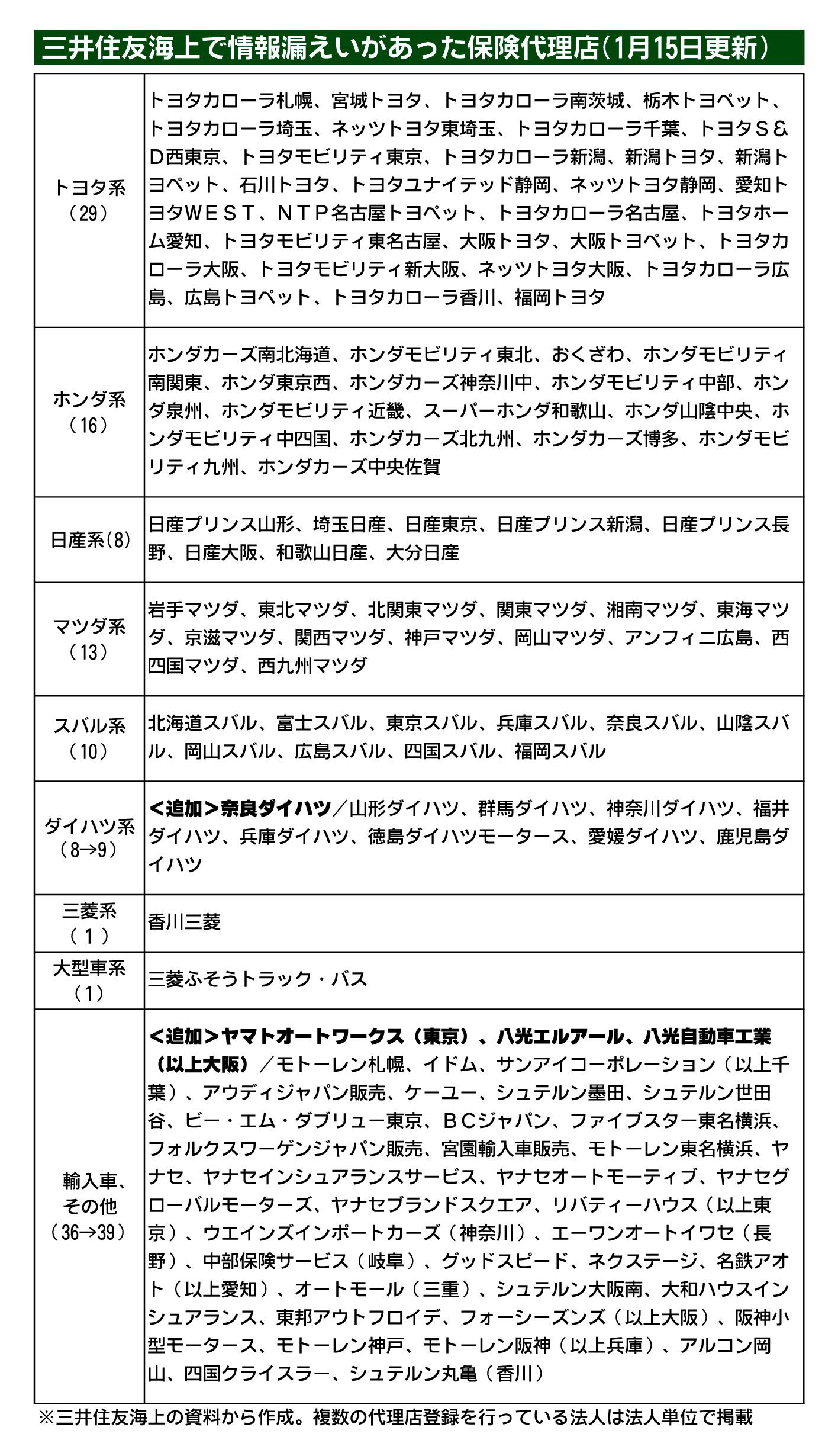 損害保険大手4社による一連の情報漏えい問題で、三井住友海上火災保険は15日、漏えいが判明した自動車ディーラーを含む保険代理店のうち、連絡先の分からない顧客がいる代理店が新たに4社確認されたと発表した。2024年9月30日の初公表から、4回目の更新。合計で126社になった。