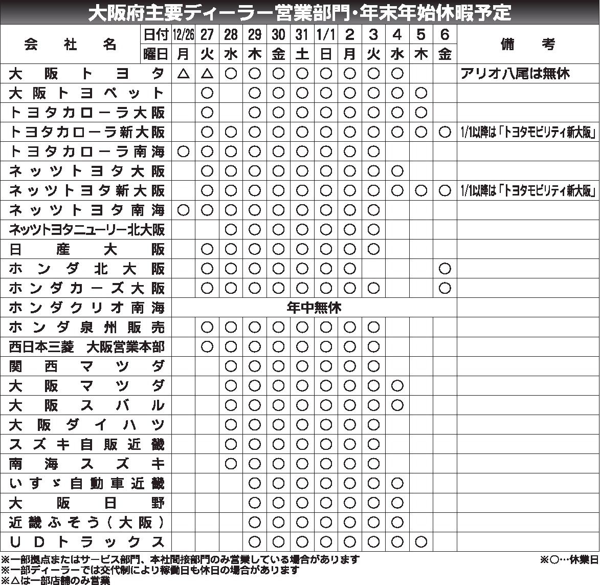 〈大阪府主要ディーラー営業部門・年末年始休暇予定〉2022/12/26~2023/1/6