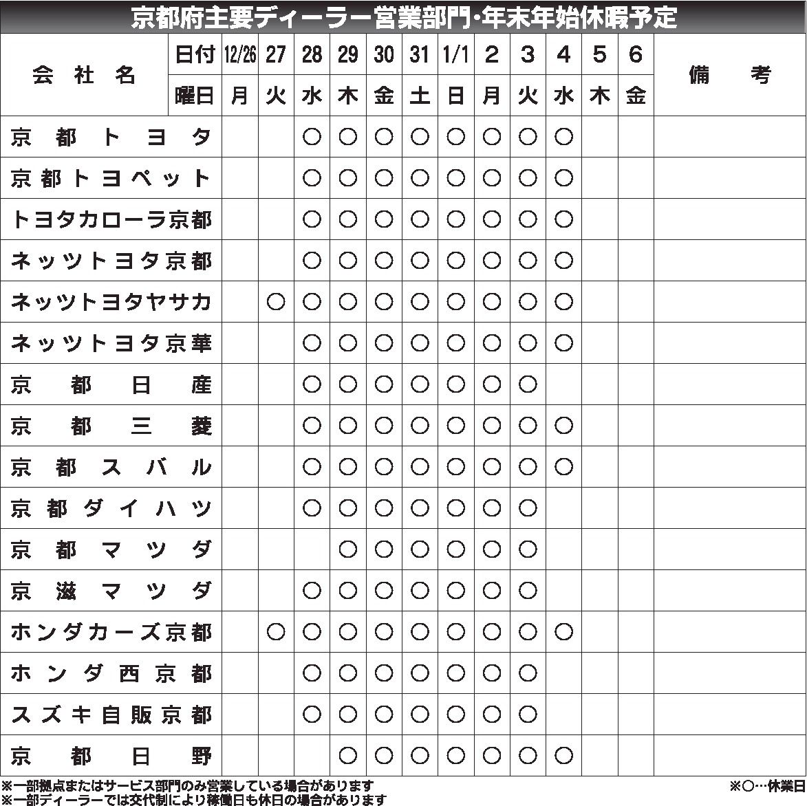 〈京都府主要ディーラー営業部門・年末年始休暇予定〉2022/12/26~2023/1/6