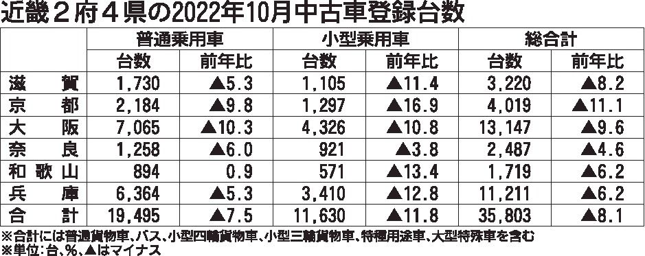 近畿2府4県における10月の中古車登録実績(軽自動車を除く)がまとまった。新規・移転・変更手続きを合算した登録台数は前年同月比8・1%減の3万5803台だった。未だに続くコロナ禍の影響で、19年同月と比較しても3千台ほど低い水準で推移した...