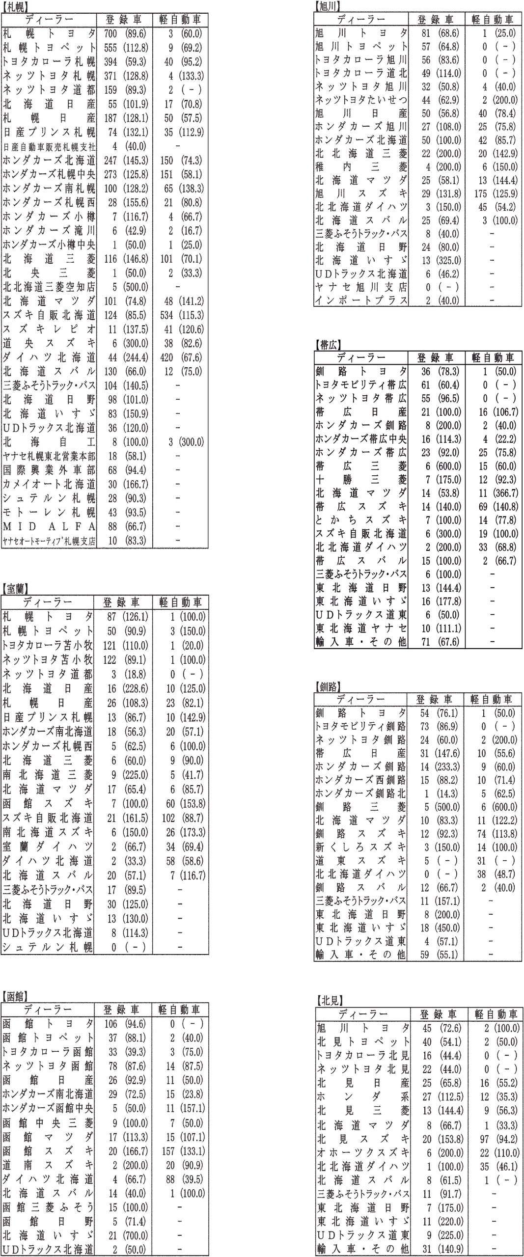 〈12月度全道管内別ディーラー別新車登録・届け出台数〉札幌管内ホンダ系・スズキ系の登録台数は自販連正会員分
