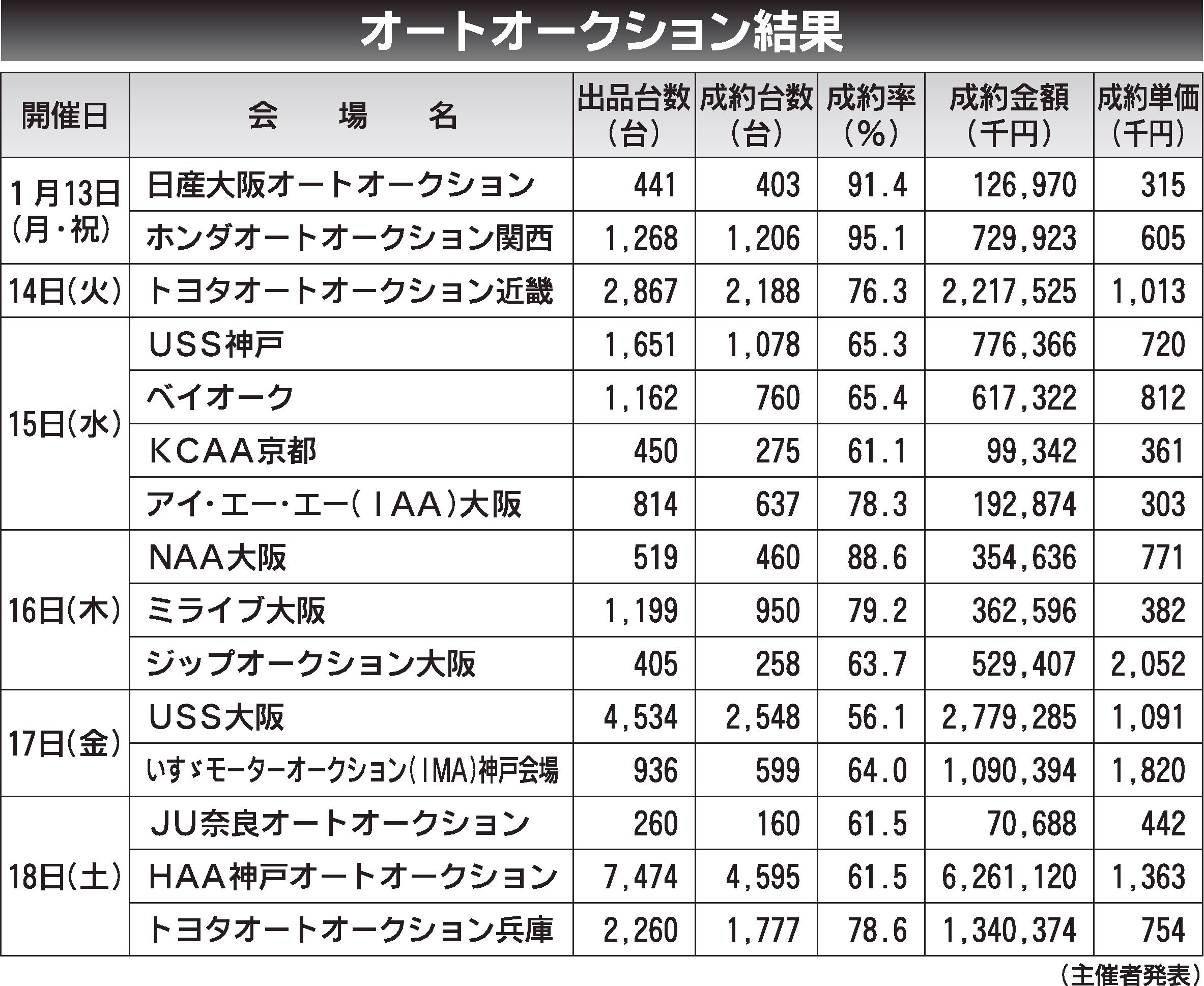 〈オートオークション結果〉近畿地区 2025/1/13~18