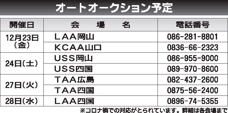 〈オートオークション予定〉中四国地区 2022/12/23~28