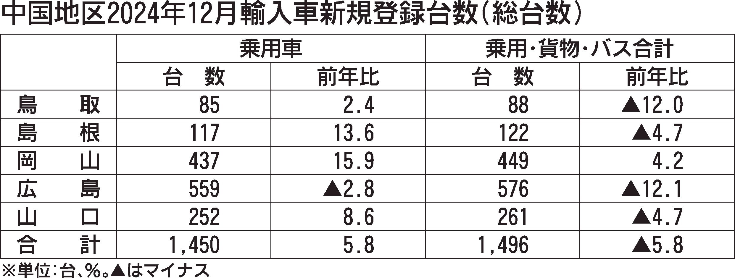 日本自動車輸入組合(JAIA)の発表によると、2024年暦年(1~12月)の中国地区の輸入車新規登録台数(外国メーカー車と日本メーカー車)は、前年同期比0.2%減の1万5761台で、2年ぶりにマイナスに転じた。乗用車のみでは同8.2%増の...