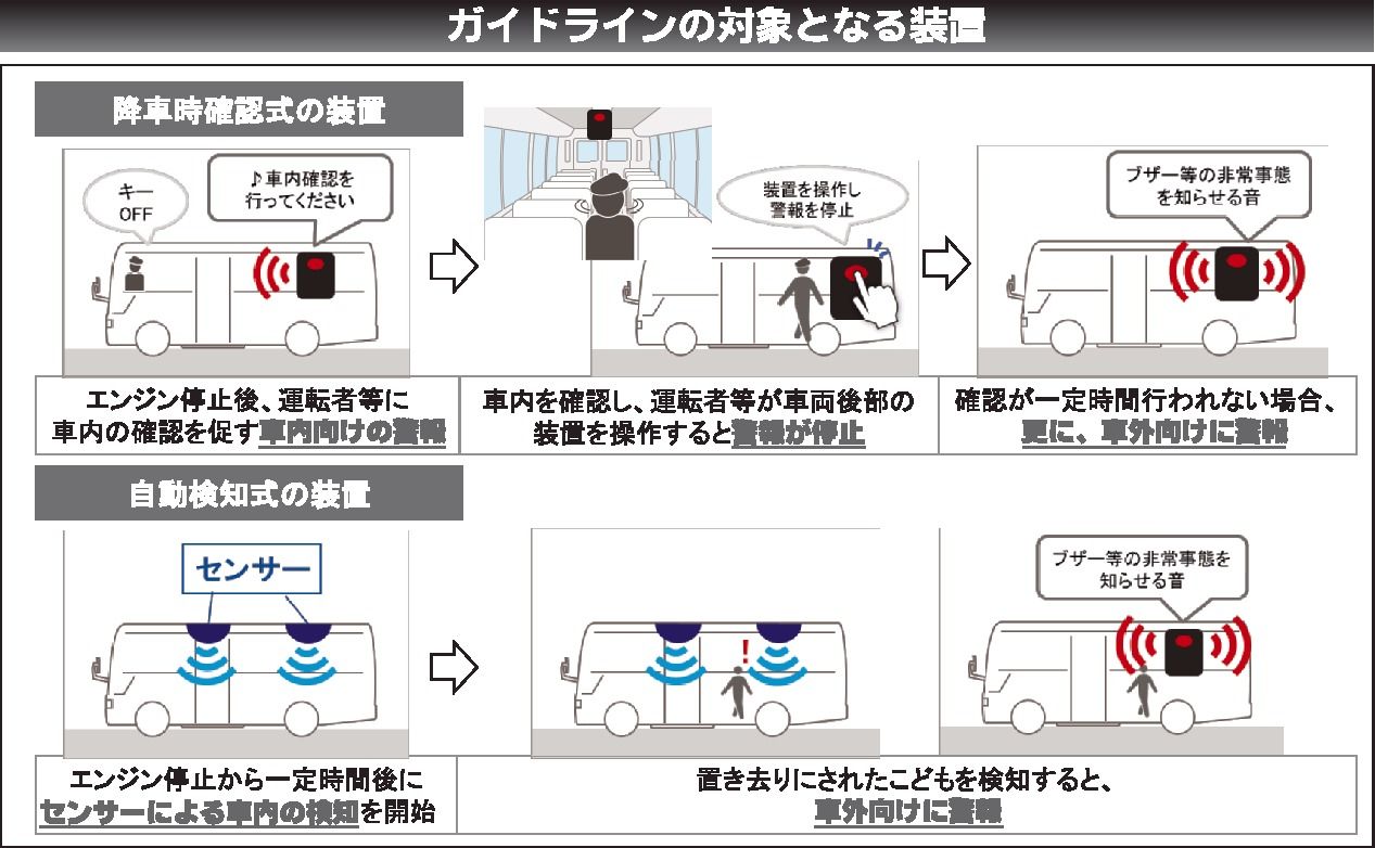 国土交通省は20日、送迎用バスでの幼児置き去り防止を支援する安全装置のガイドラインを策定した。装置を「降車時確認式」「自動検知式」の2つに大別し、各方式の要件と両方式に共通する要件を定めた。主な内容は次の通り。 ガイドラインでは、置き去り...