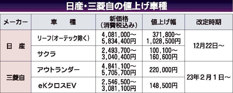 日産自動車と三菱自動車は22日、合わせて4車種の電動車を値上げすると発表した。日産は「サクラ」「リーフ」、三菱自は「アウトランダー」「eKクロスEV」。電池材料価格や輸送費の上昇が主な理由だ。値上げ幅はサクラで約10万~約16万円、リーフで約37万~約103万円、アウトランダーが22万円、eKクロスEVは約15万円。