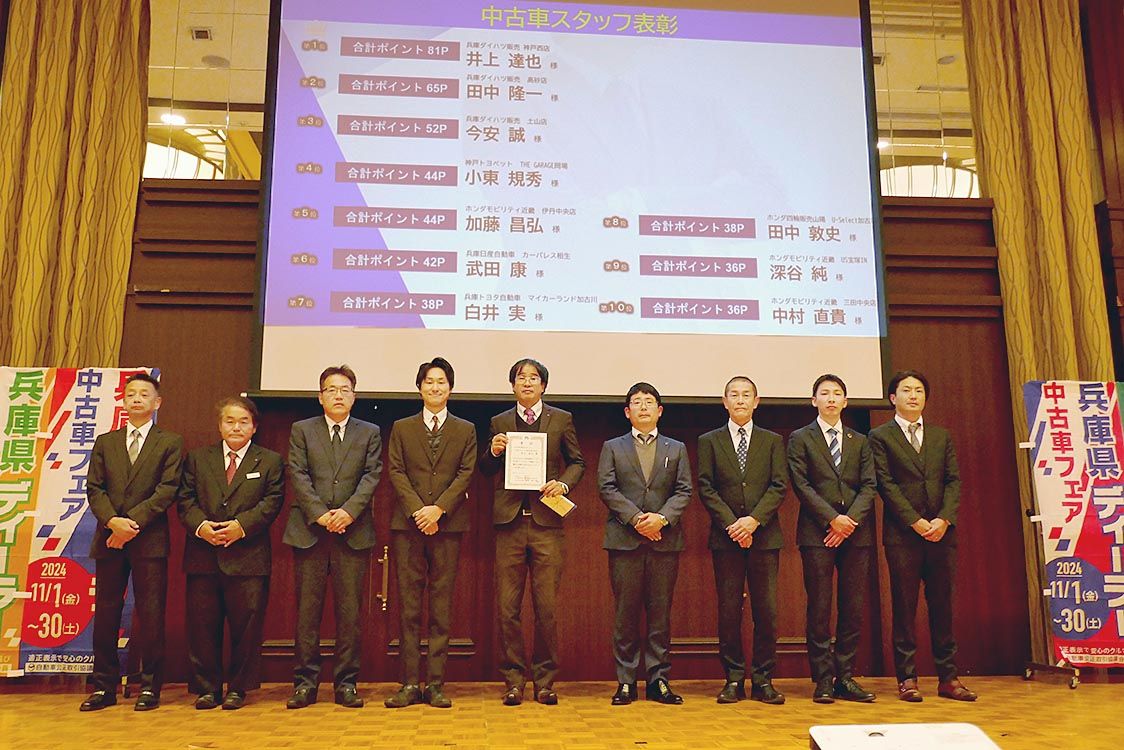 【神戸】日本自動車販売協会連合会(自販連)兵庫県支部(長手繁支部長)は、神戸市内のホテルで「2024年兵庫県中古車ディーラーフェア表彰式」を開いた。フェアの結果報告のほか、優秀な成績を収めた営業スタッフの表彰や、期間中の成約者に贈る各種抽...
