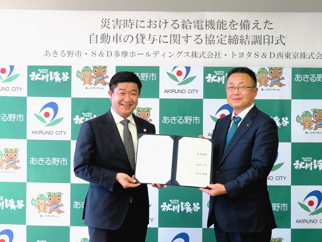 S&D多摩ホールディングス(S&D多摩HD、田村勝彦社長)とグループのトヨタS&D西東京(同)は、東京都あきる野市(中嶋博幸市長)と「災害時における給電機能を備えた自動車の貸与に関する協定」を締結した=写真。同社グループが都内の自治体と同...