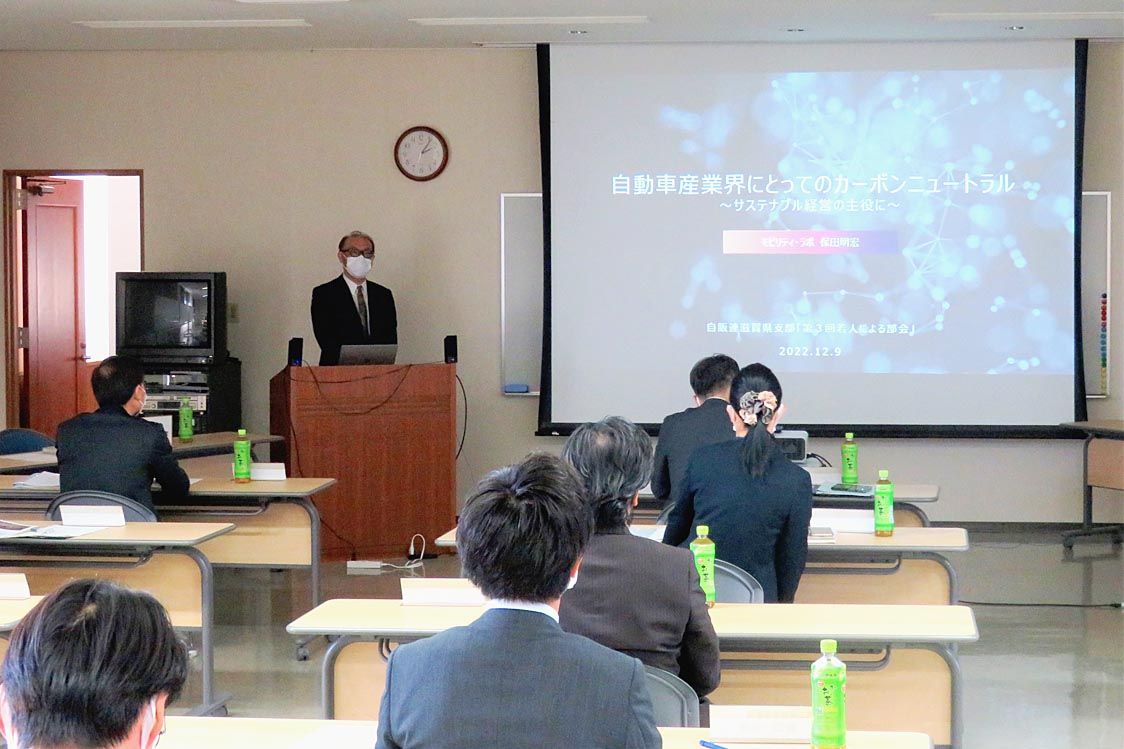 【大津】日本自動車販売協会連合会(自販連)滋賀県支部(中嶋善夫支部長)は、守山市の滋賀県自動車販売協会会館で「若人による部会」を開催した=写真。支部加盟の各社から若手スタッフが集い、カーボンニュートラルに関して講演会を実施し、出席者による...