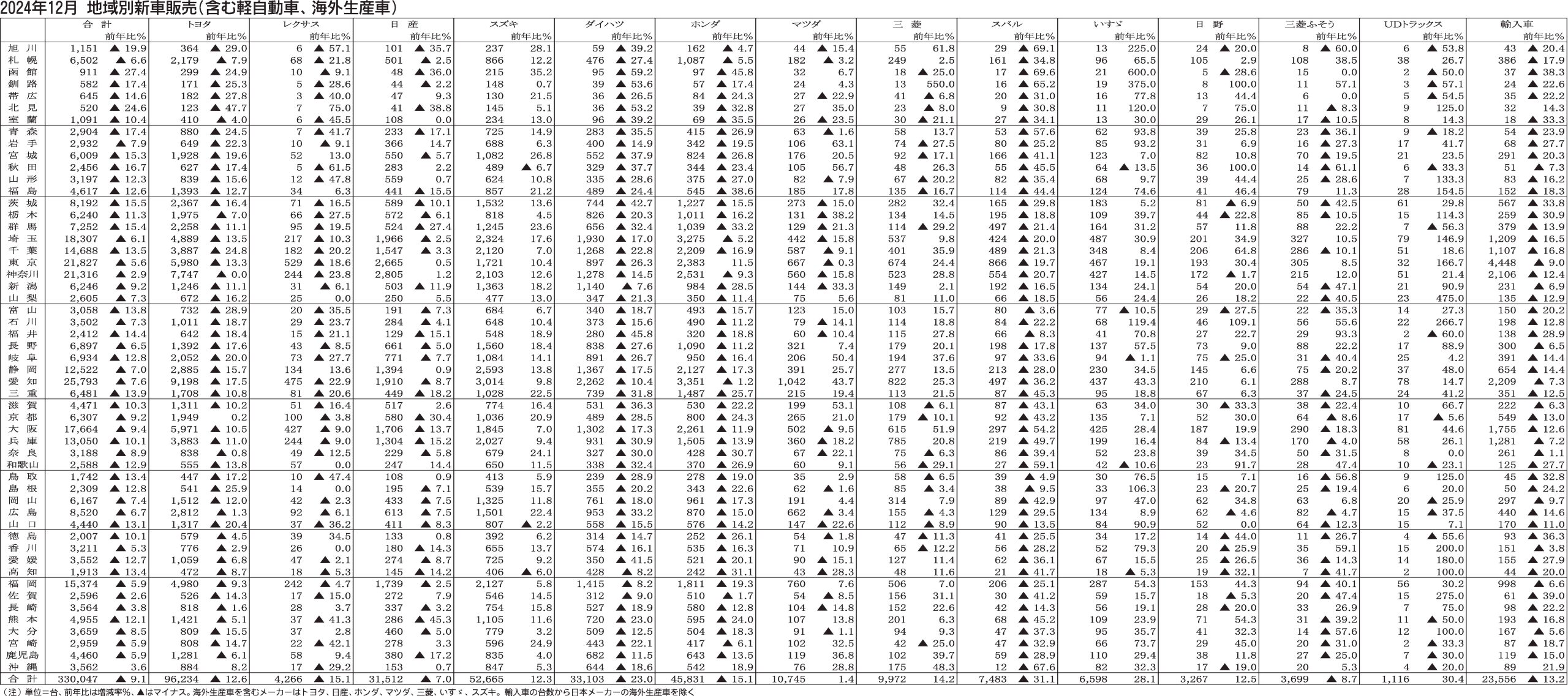 〈2024年12月 地域別新車販売(含む軽自動車、海外生産車)〉