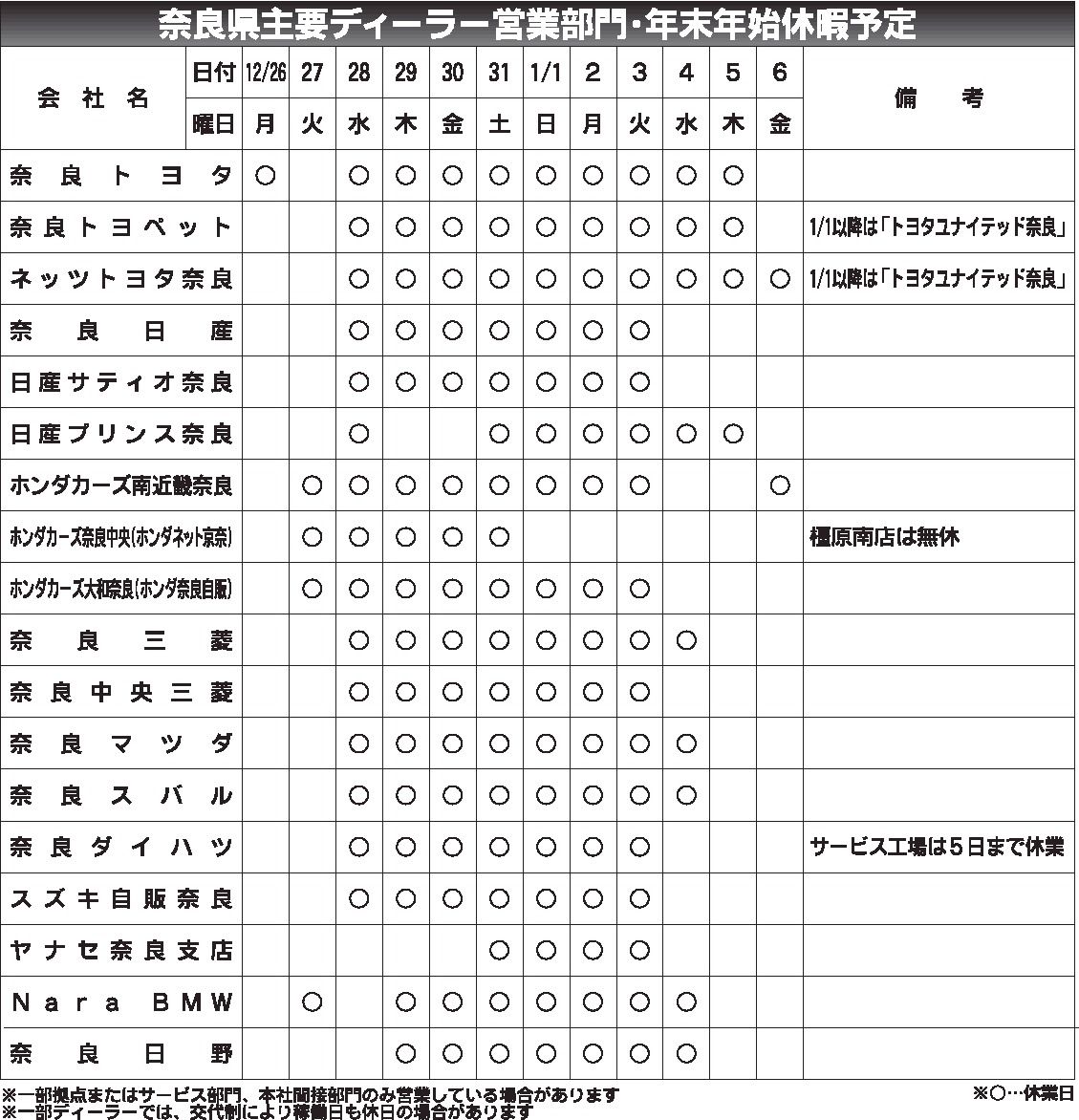 〈奈良県主要ディーラー営業部門・年末年始休暇予定〉2022/12/26~2023/1/6