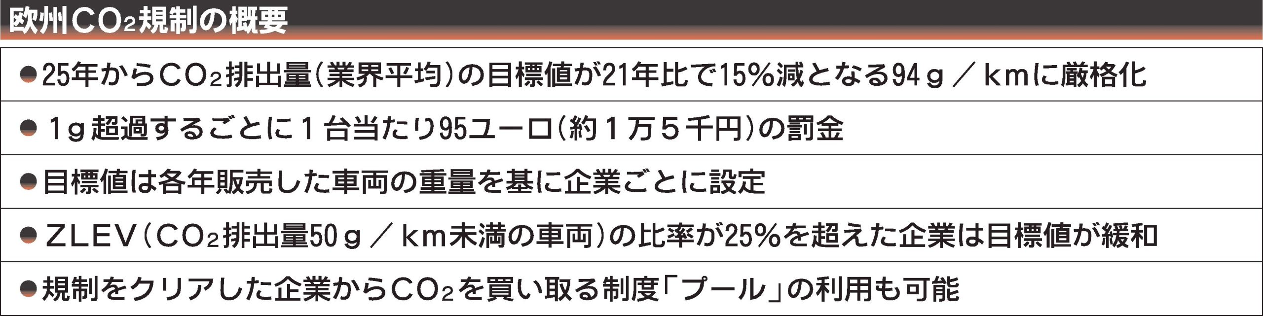 1月から欧州の二酸化炭素(CO2)排出量規制が厳格化された。2021年の基準と比べて15%低い水準に企業平均燃費(CAFE)を抑制する必要がある。現時点で目標値をクリアできているのはテスラとボルボ・カーの2社のみで、日本メーカーを含む大半...