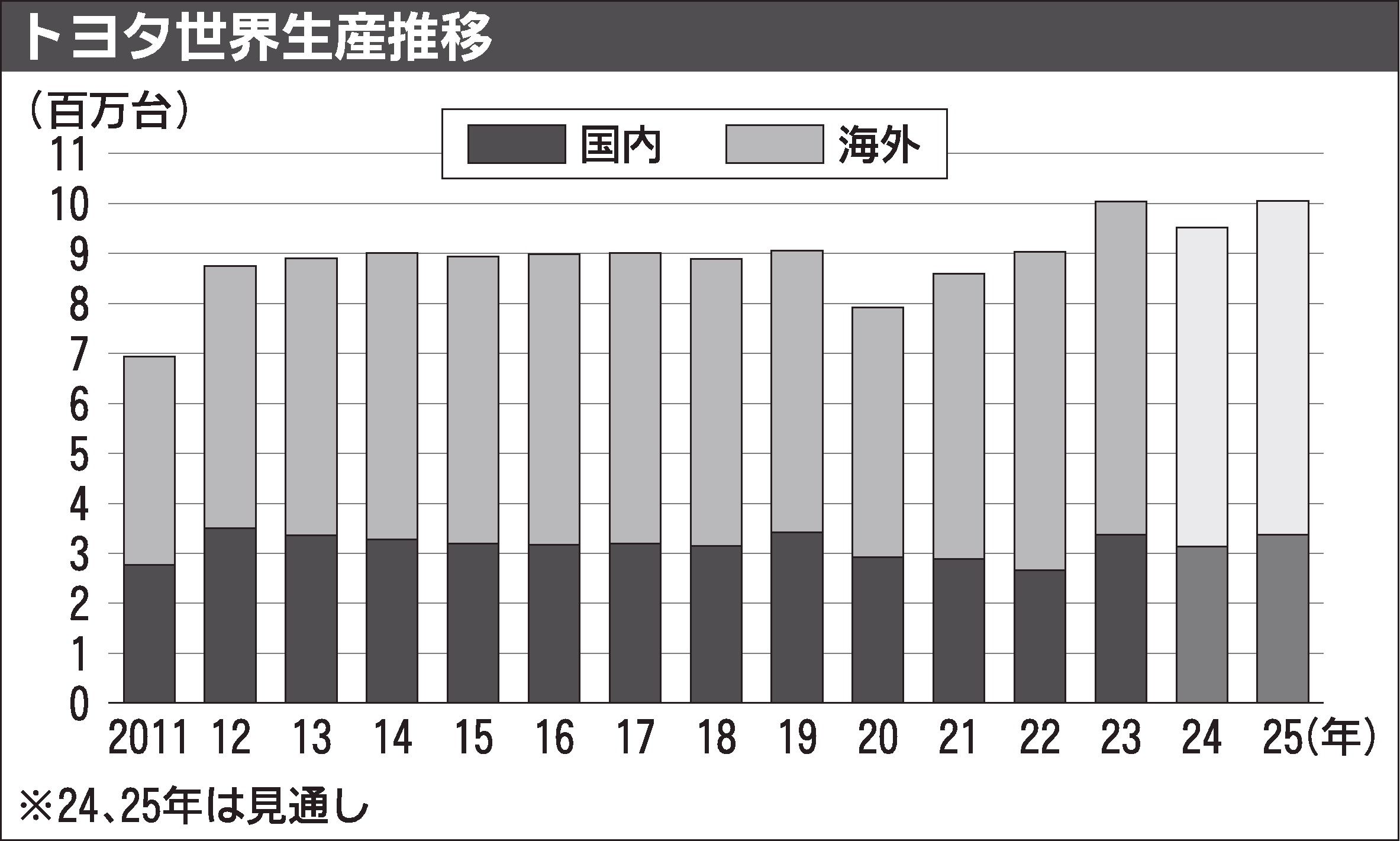 トヨタ自動車は、2025年暦年の国内生産(トヨタ車、レクサス車)を約340万台とする計画を固めた。24年に比べ1割ほど増え、3年連続で300万台を超える見通し。海外生産は微増の約660万台とし、国内外を合わせた世界生産は約1千万台とした。...