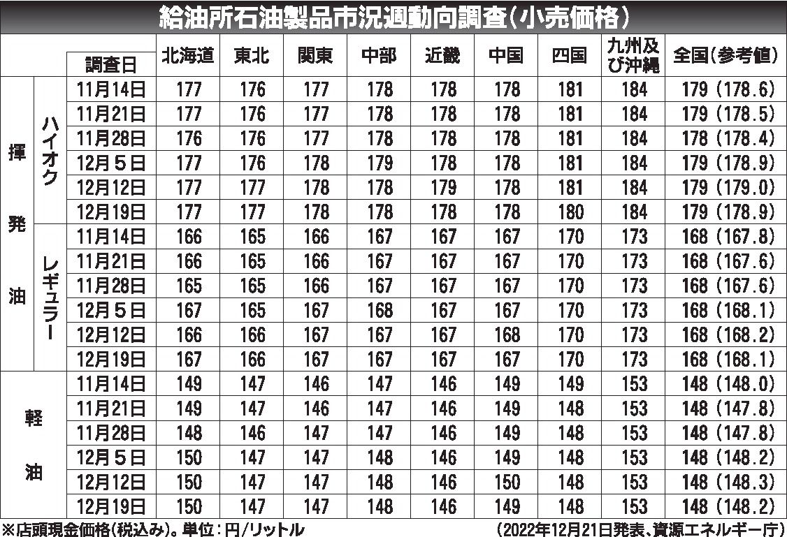 〈給油所石油製品市況週動向調査(小売価格)〉2022/11/14~12/19