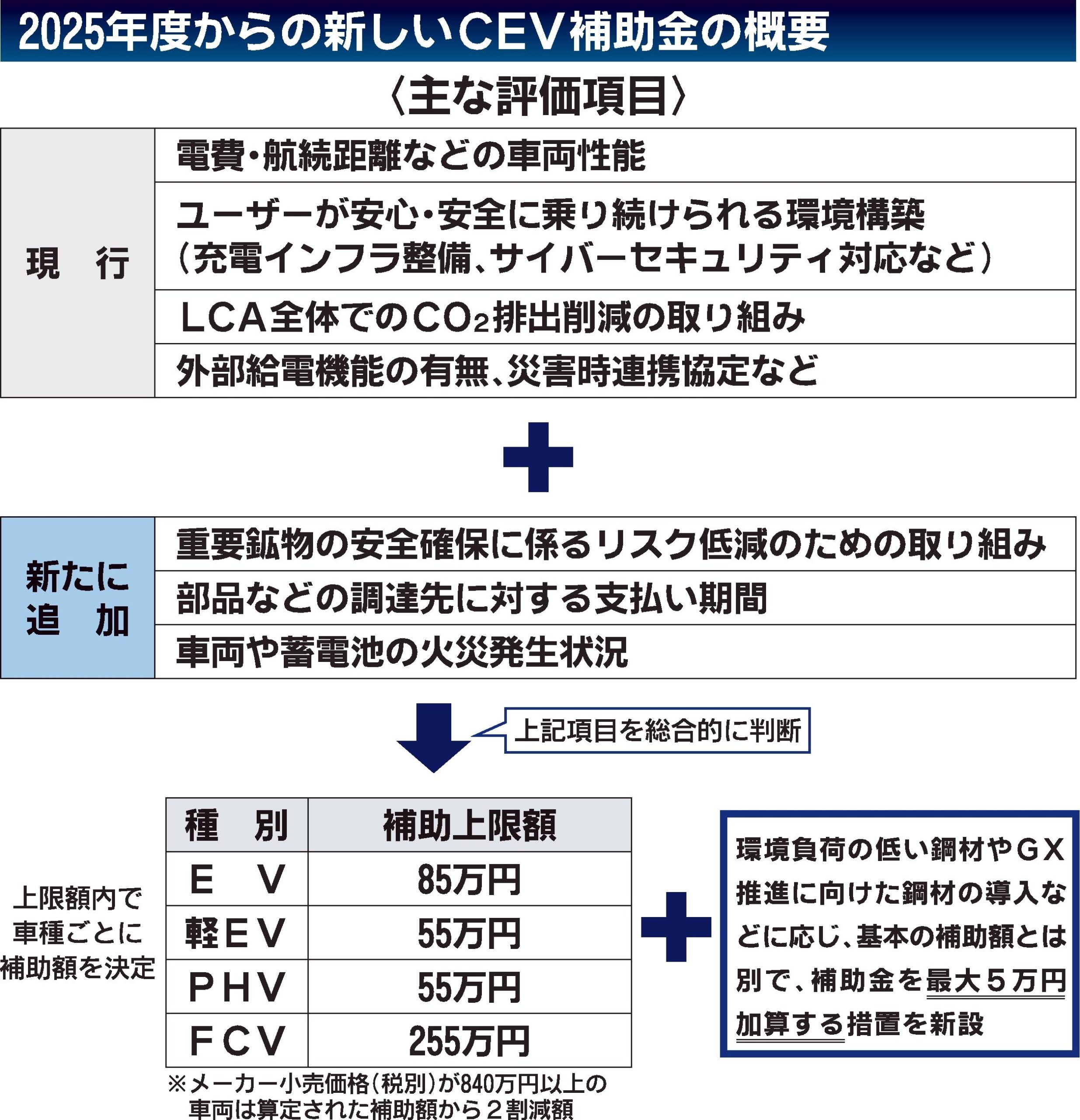 経済産業省は、電気自動車(EV)などの購入費用を補助する「クリーンエネルギー自動車(CEV)補助金」において、2025年度分の取り扱いを決めた。補助額を算定する評価項目に、重要鉱物の安定確保に向けた取り組みや、車載電池の安全性などを追加す...