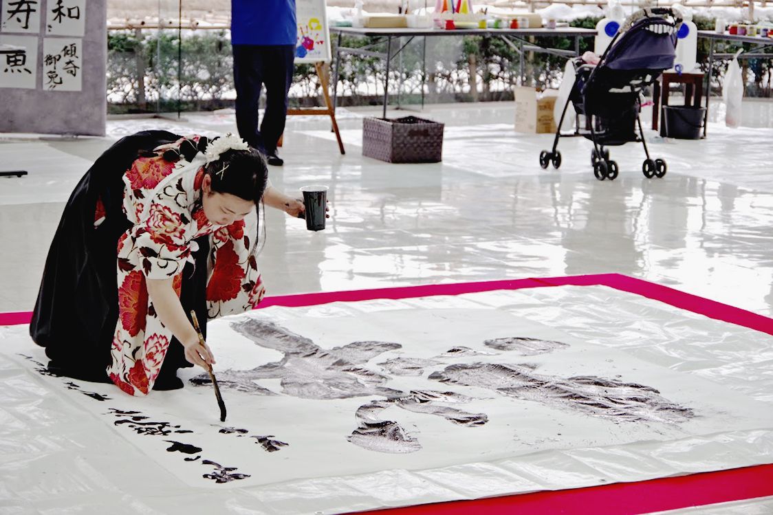 〇…ネッツトヨタ道都(内間木忠行社長)の中央店ショールームで特大書道パフォーマンスが行われた。記された文字は、同社が展開する「絆プロジェクト」の「絆」。新琴似店の営業スタッフとして働く横山泉実さんが筆を執り、ショールームで迫力の書道を披露...