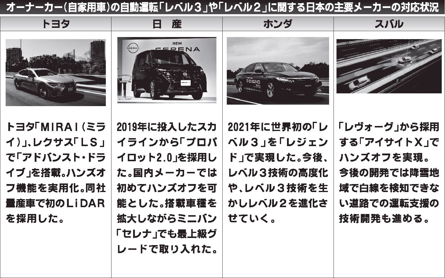 自家用車(オーナーカー)向け運転支援技術の開発が加速している。ホンダは、自動運転「レベル3」(特定条件下での自動運転)車両の経験を生かし、手放し状態で走る「ハンズオフ機能」を幅広く展開する方針。高価なLiDAR(ライダー、レーザースキャナ...