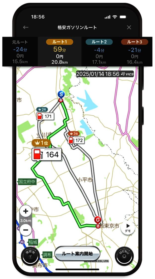 ナビタイムジャパン(大西啓介社長、東京都港区)は、カーナビゲーションアプリ「カーナビタイム」に、給油価格が安いガソリンスタンド(給油所)を経由したルートを検索できる「格安ガソリンルート」の機能を追加した。目的地までのルート周辺にある給油所...