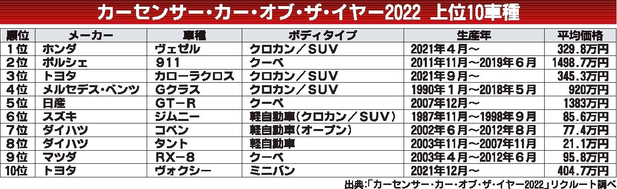 リクルートが運営する中古車情報メディア「カーセンサー」が、毎年12月に選出する中古車ランキング「カーセンサー・カー・オブ・ザ・イヤー2022」。今年のトップには、ホンダのSUV「ヴェゼル」(21年発売モデル)が輝いた。ヴェゼルは全面改良し...
