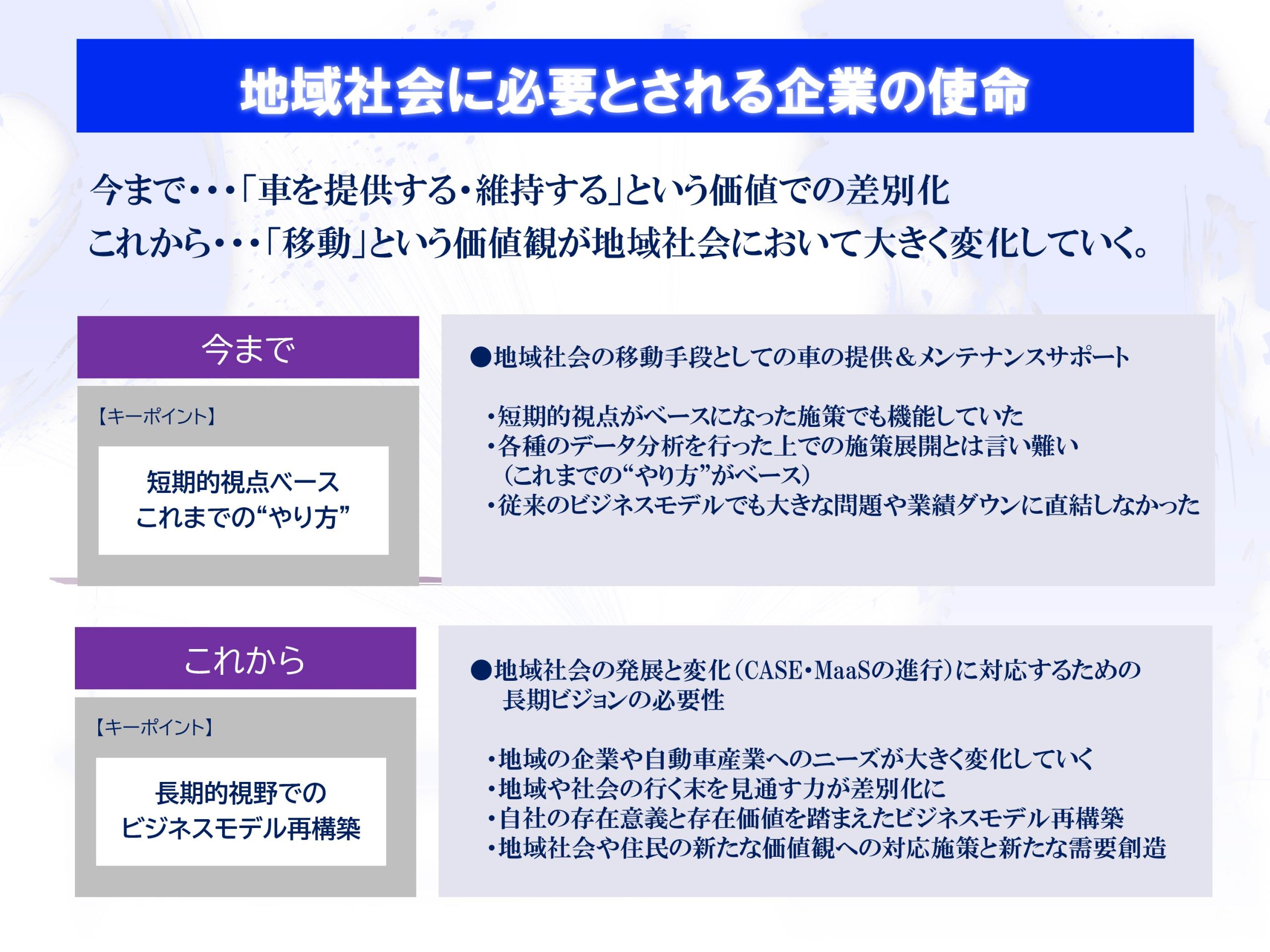 樋口代表は「100年に一度の大変革期で、保有ビジネスの市場縮小は続く。25年~30年に向け、これまでの事業者側のルールに基づく販売・車検・保険といった点のアプローチではなく、顧客心理や地域ニーズに合わせて、顧客情報をしっかりと獲得蓄積して利活用し、付加価値向上につなげる施策が重要」と取り組む。例えば、自動車メーカー系では顧客満足向上に向け、系列の統合やコネクテッドサービスの拡大による情報の集約化が加速傾向にある。一方で消費者に寄り添う役割のはずの自動車販売店では、量を追求する価格訴求の専門店や大型拠点化が多く、集約したコネクテッド情報を活かす体制が整っていないのが実情だ。整備事業者では、特定整備対応や整備人材の不足化と課題は多い。そこで研究会では、目先の状況だけでなく、中長期を見据え、顧客・地域視点を強化・定着することで、顧客一人ひとりとのつながりを深め、LTV(顧客生涯価値)の変化に対応する体制づくりを進める。現時点で〝顧客視点のバリューチェーン戦略〟を軸に、車販、車検整備、保険、MaaS(サービスとしてのモビリティ)、地域共創をエリアで支える事業展開の可能性を高めている。新規顧客づくりの追求から既存客の深堀りに向けて、事例なども踏まえて連載で紹介する。