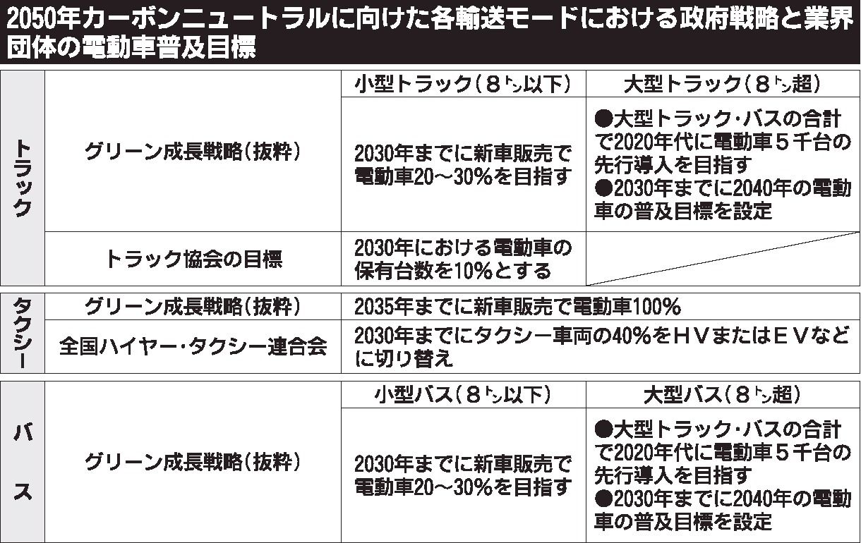 政府は21年6月、経済と環境の好循環を目指す産業政策「グリーン成長戦略」を見直して、商用車の脱炭素化に向けた目標を盛り込んだ。この時、乗用車の新車販売で35年までに電動車100%を目指すことも取り決めた。