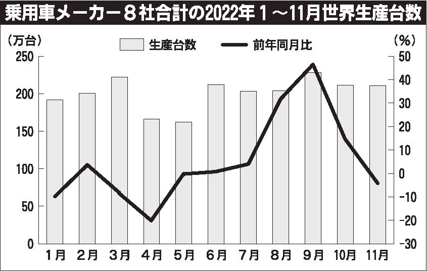22年の乗用車メーカー8社の世界生産台数は、半導体不足や新型コロナウイルス感染拡大に伴う部品調達難などの影響を受け、1月は前年同月比9.8%減とマイナスのスタートとなった。2月にプラス転換したが、3~5月は再びマイナスとなった。