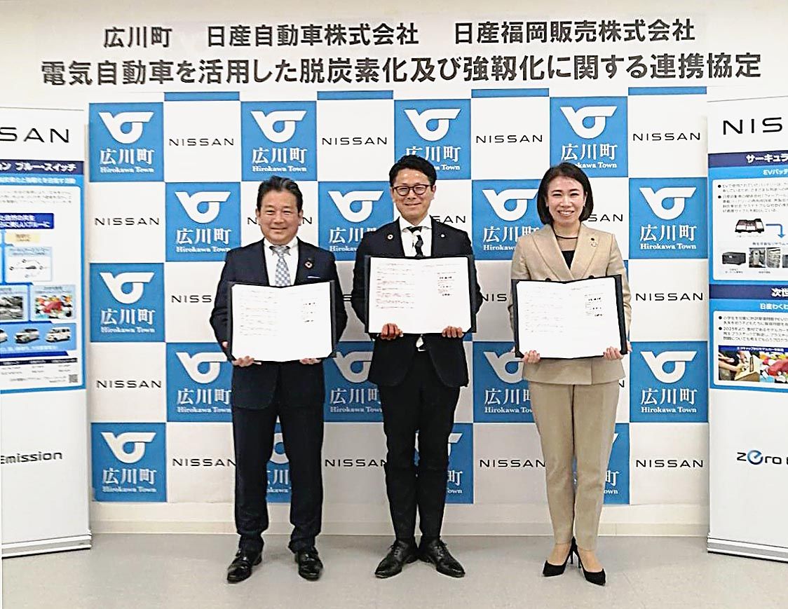 日産自動車と日産福岡(内野伸一社長)と広川町の3者は「電気自動車(EV)を活用した脱炭素化及び強靭(きょうじん)化に関する連携協定」を締結した。EVの普及促進を図る啓発活動を進めるとともに、災害による停電発生時には避難所などへEVを貸与し...
