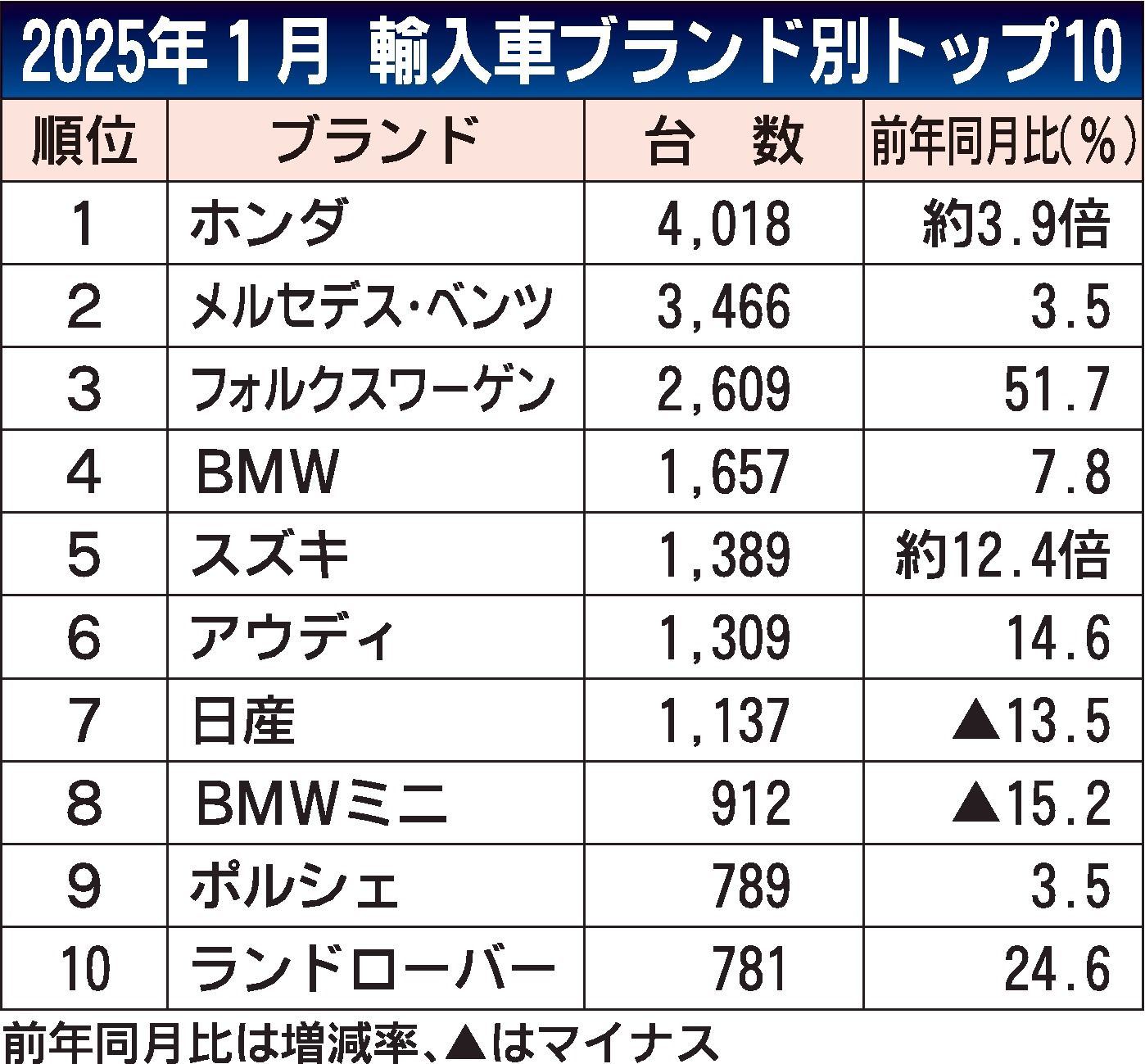 VWは、24年7月に発表した「ゴルフ」「T―クロス」の一部改良車や、全面改良した「ティグアン」「パサート」などが24年末頃から入荷し始め、受注残の登録が1月に進んだ。VWは、日本への車両供給が滞るなどして24年7月以降、前年同月比で3~6割減という大幅なマイナスが続いていた。関係者によると、ドイツ本国で日本向けにソフトウエアや電装系の適合調整をするのに手間がかかっていたという。もともと登録台数ではメルセデス・ベンツ、BMWと並ぶ「御三家」とされる有力ブランドだったため、24年の外国メーカー車の新規登録台数が2年ぶりのマイナスになった要因の一つとなっていた。
