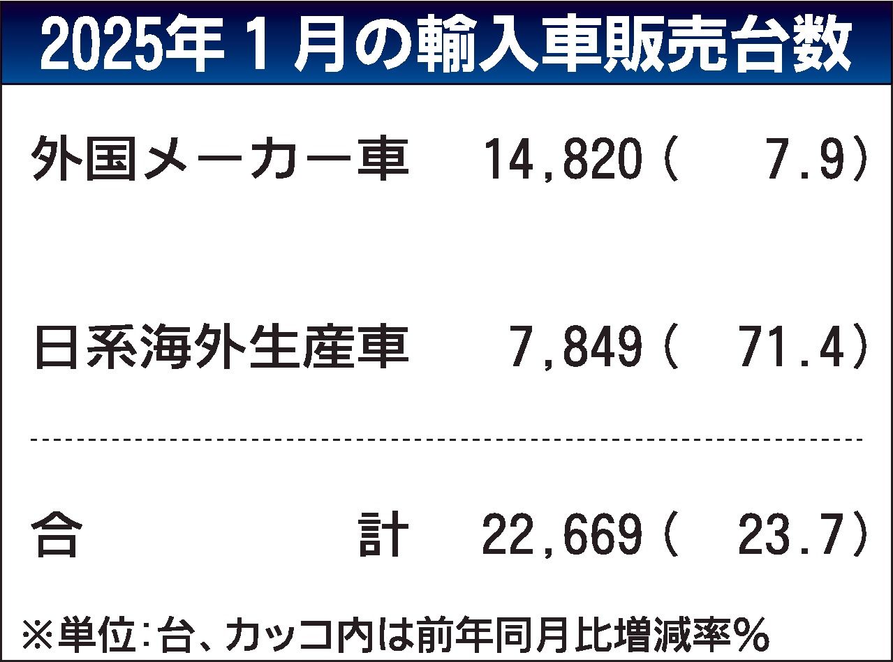 日本自動車輸入組合(JAIA、ゲルティンガー剛理事長)が6日に公表した2025年1月の外国メーカー車新規登録台数は、前年同月比7.9%増の1万4820台となり、ほぼ1年(13カ月)ぶりにプラスへ転じた。フォルクスワーゲン(VW)車が2609台(同51.7%増)と24年6月以来、7カ月ぶりに前年同月を上回ったことが大きかった。