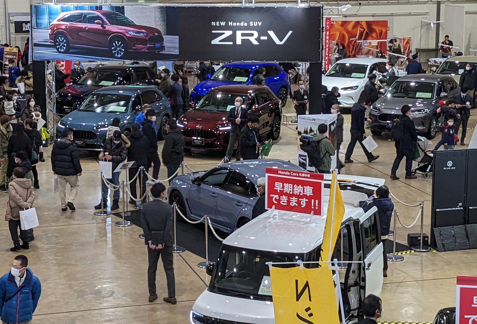 新車の長納期化で多くの受注残を抱えているものの、新車ディーラー各社は年間最大の商戦期である年度末に向けて受注獲得活動を活発化している。屋内イベント会場で実施するHC札幌中央の初ホンダ2023では、屋内展示場に新車30台のほか、中古車約140台を展示。オープンととともに早速商談に進む姿もあるなど、会場は活気づいた。とくに4月発売予定の新型SUV「ZR-V」への関心が高く、展示車の周りには多くの来場者が集まっていた。