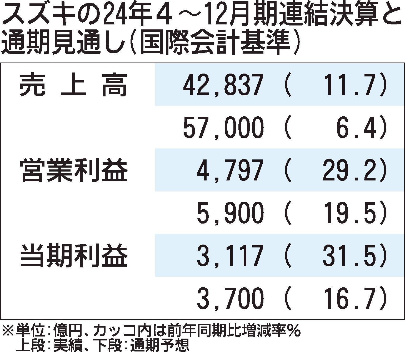 スズキは6日、2025年3月期の売上高と利益項目すべてを上方修正すると発表した。2024年4~12月期で、日本を中心とした販売増、グローバルでの原価低減活動、為替影響で増収増益となったことから、売上高は前回公表値から1千億円、営業利益は同400億円、当期利益は同200億円、それぞれ引き上げた。