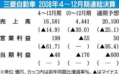 三菱自動車が4日、東京都内で開いた2008年4~12月期連結決算会見における、主な質疑応答は次の通り。 ―販売の底はいつか、また09年の見通しは 益子修社長「本日現在、2009年度中に底入れやV字回復するという情報を持っていない。いつ、ど...