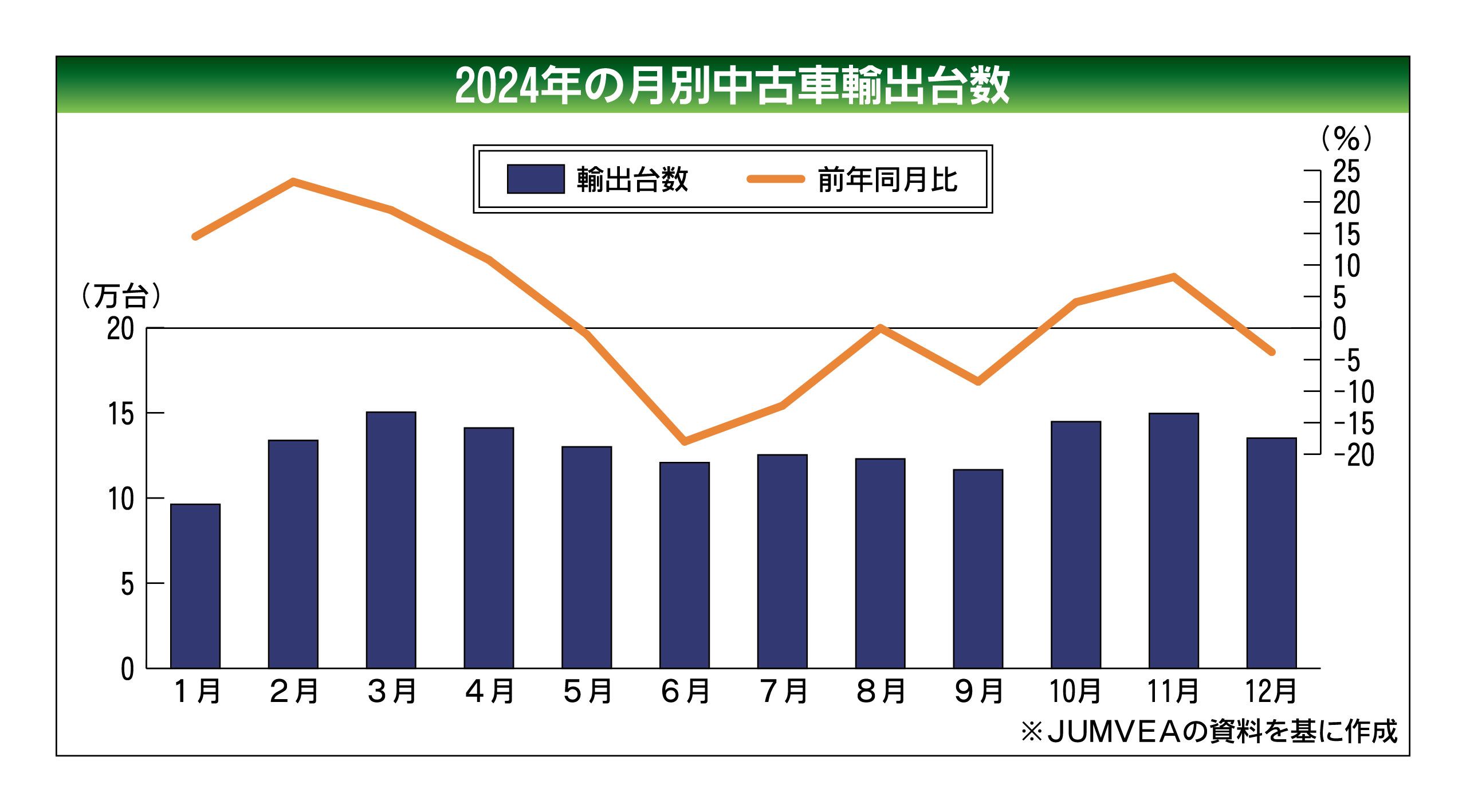 日本中古車輸出業協同組合(JUMVEA、佐藤博理事長)が公表した2024年の中古車輸出台数(車両価格20万円以上)は、前年比2.0%増の156万6621台となり、2年連続で過去最高を更新した。前年超えは4年連続。仕向け地別ではアラブ首長国...