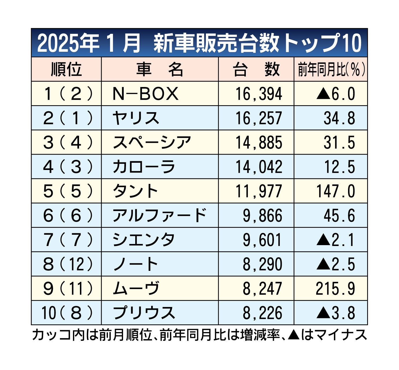 日本自動車販売協会連合会(自販連、加藤敏彦会長)と全国軽自動車協会連合会(全軽自協、赤間俊一会長)が6日発表した統計をまとめた。受注残が積み上がっていた小型SUV「ヤリスクロス」の納車が進んだことで、ヤリスは前年同月から3割以上増加。ただ、前月の実績から落ち込み幅を約18ポイントも改善したエヌボックスに一歩及ばなかった。両モデルの差は137台で、2月に順位が逆転する可能性もある。