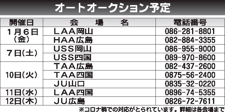 〈オートオークション予定〉中四国地区 2023/1/6~12