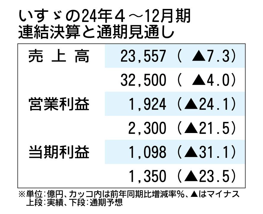 いすゞ自動車が2月7日に発表した2024年4~12月期の連結業績は、売上高が前年同期比7.3%減の2兆3557億円、営業利益が同24.1%減の1924億円となり、4年ぶりに減収減益となった。値上げや円安による押し上げ効果があったものの、タイなど海外市場での販売低迷が響いた。