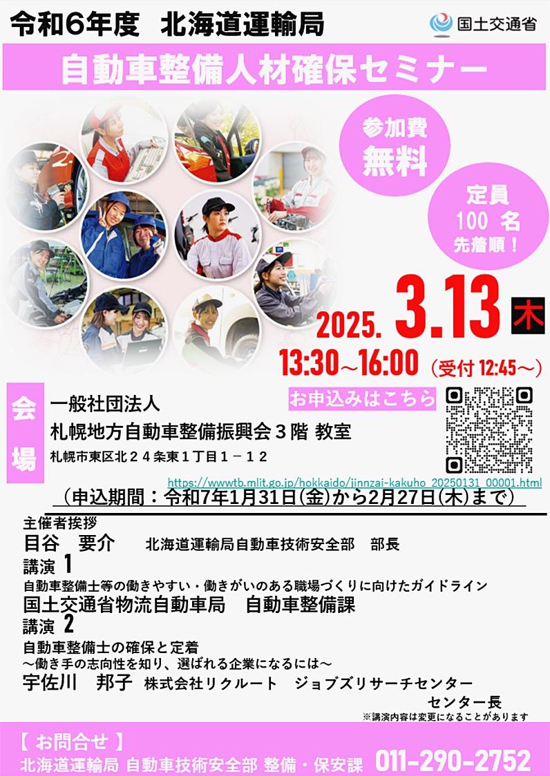 北海道運輸局、3月13日に人材確保セミナー開催 整備工場経営層を対象に