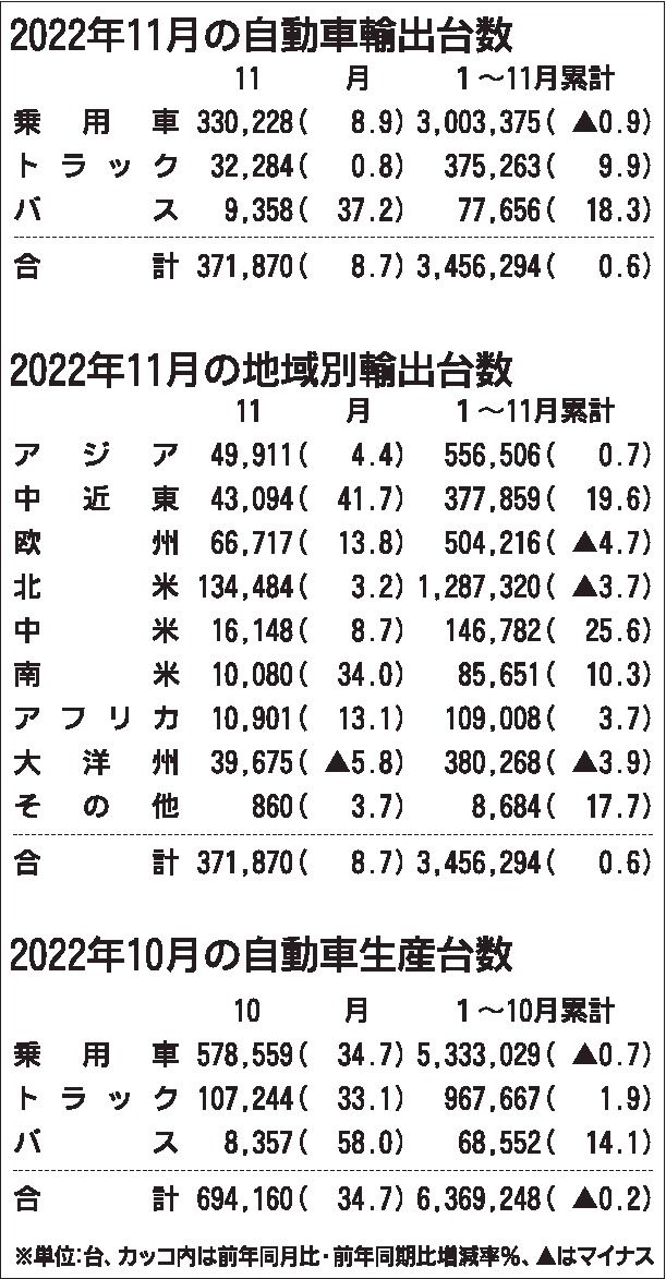 日本自動車工業会(豊田章男会長)が12月28日に発表した11月の自動車輸出台数は、37万1870台(前年同月比8.7%増)と4カ月連続で前年を上回った。地域別でも、大洋州を除き全地域で前年超えとなった。最大仕向け地の北米は13万4484台(同3.2%増)、欧州は6万6717台(同13.8%増)だった。車種別は乗用車、トラック、バスとも前年を上回ったが、いずれも伸び幅は前月に比べ縮小した。