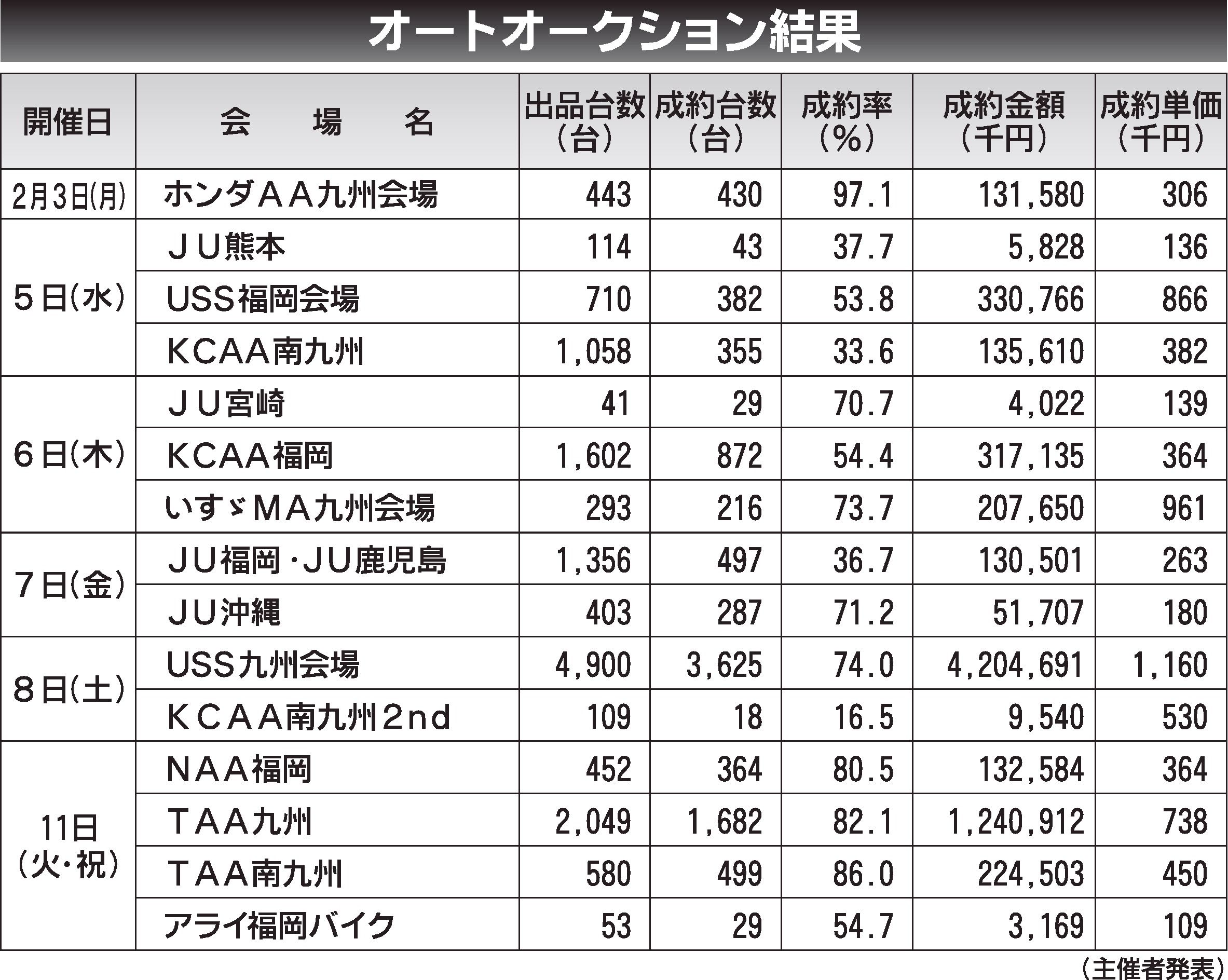 〈オートオークション結果〉九州地区 2025/2/3~11