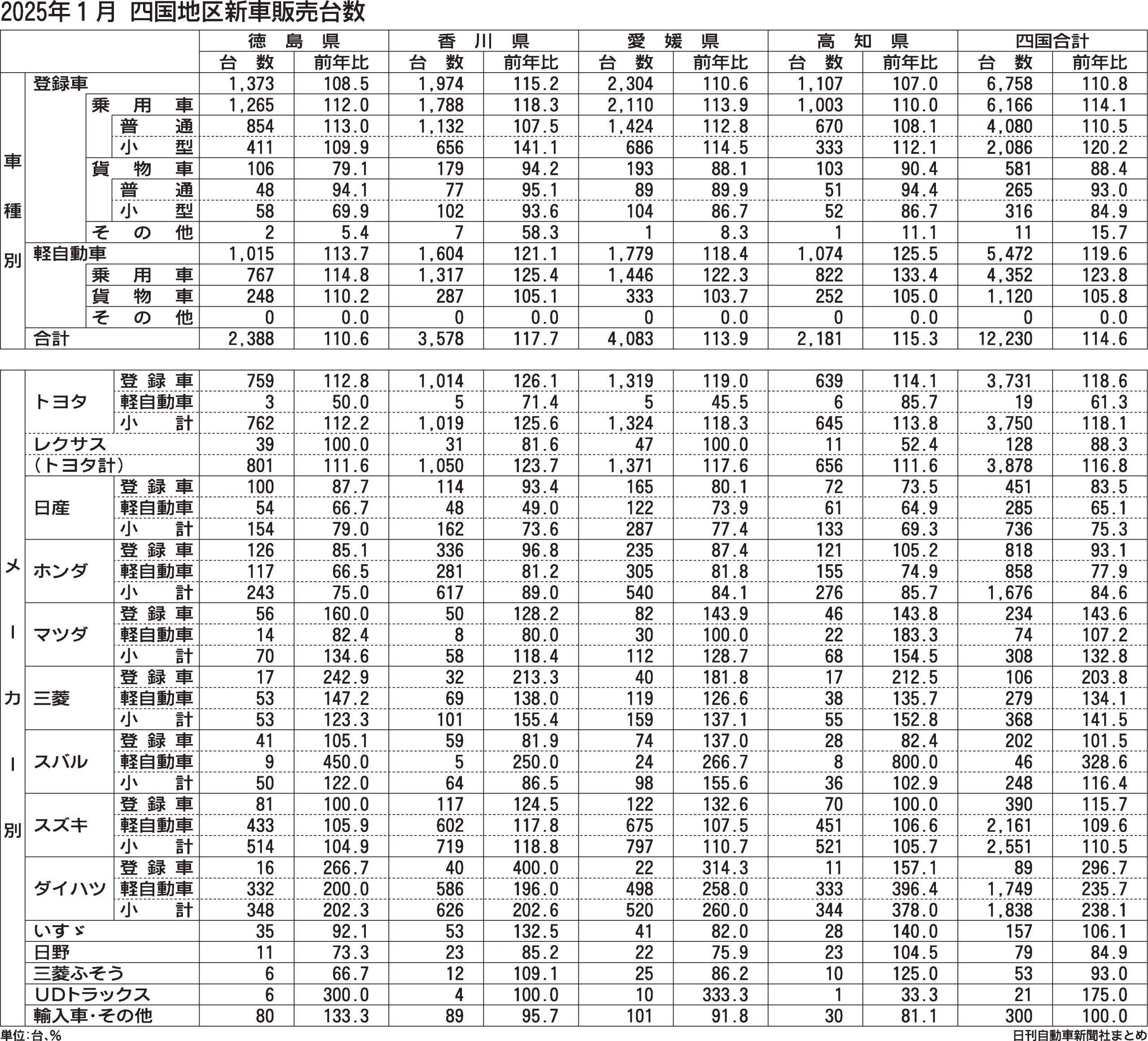 四国地区2025年1月新車販売、3ヵ月ぶり増加