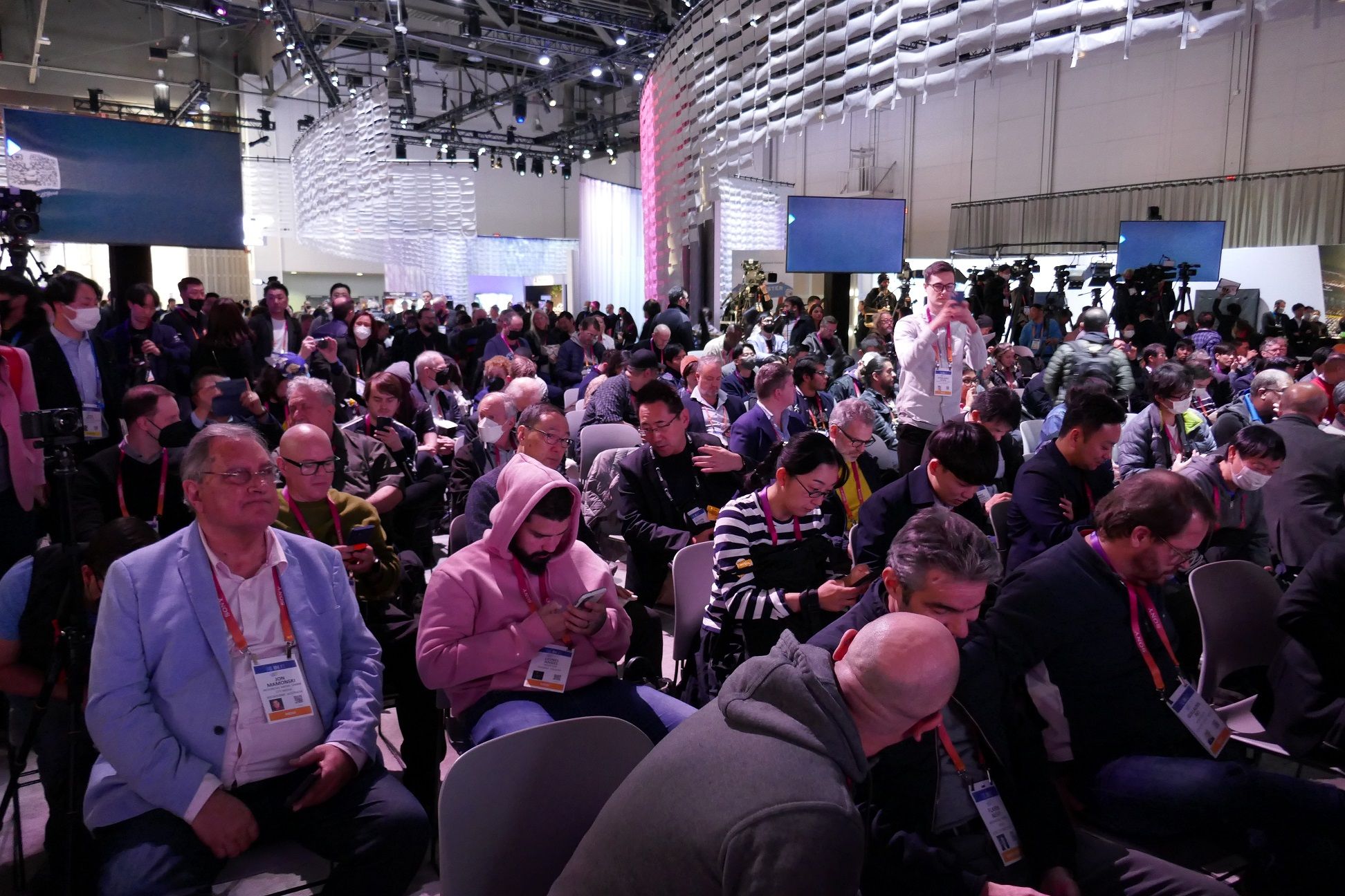 報道陣向けイベントは現地時間4日(水)17時から。ラスベガスコンベンションセンターのソニーブースで行われたが、取材受付の看板前には15時過ぎから順番待ちの列が伸び始め、会場オープンとなった16時半には100メートルを超すほどの長蛇の列ができていた。