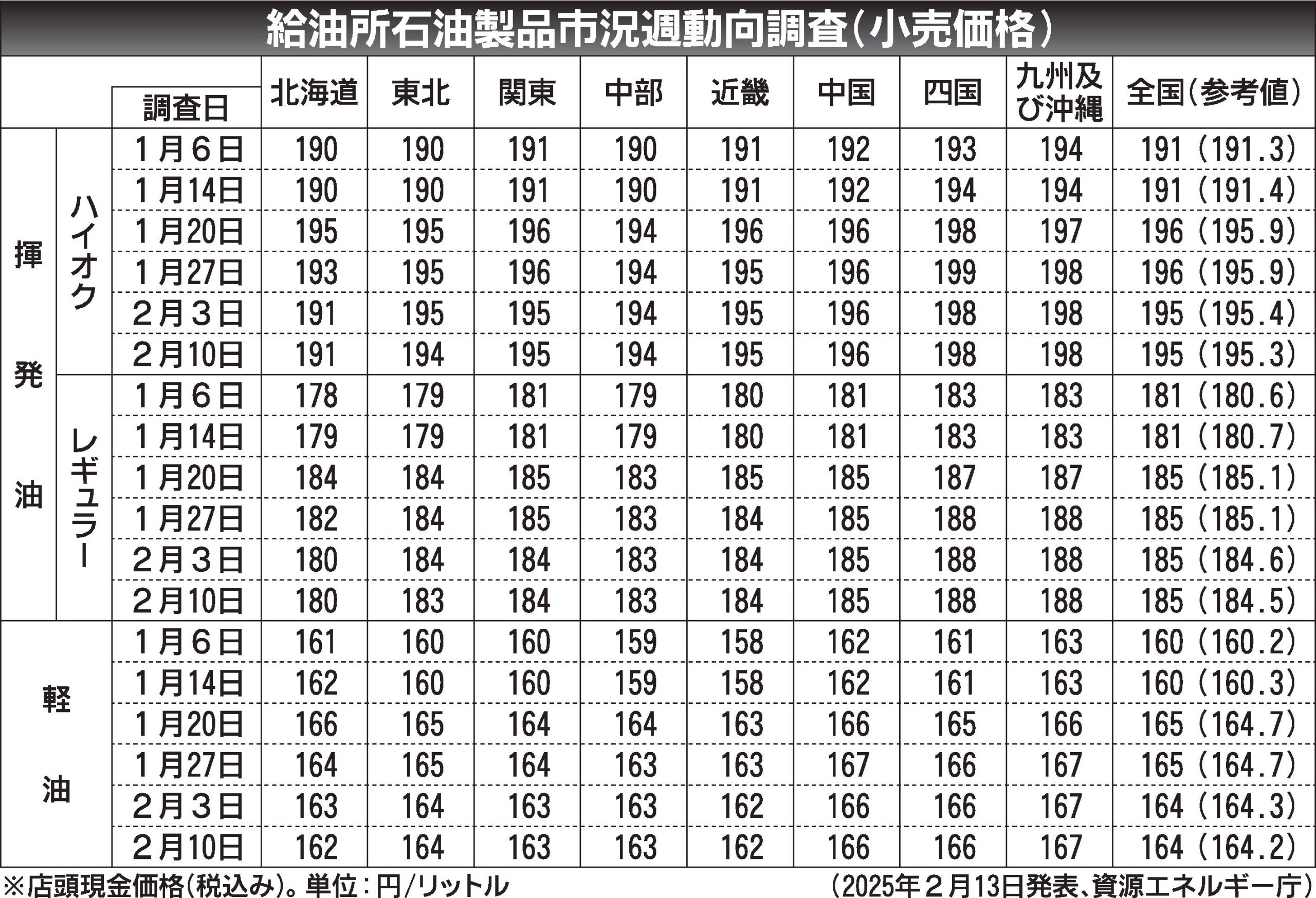 〈給油所石油製品市況週動向調査(小売価格)〉2025/1/6~2/10