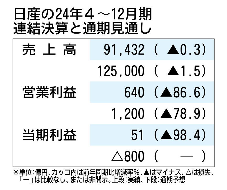 日産の通期見通し、4年ぶり赤字 純損失800億円 インセンティブ増加で4~12月期は86.6%減益