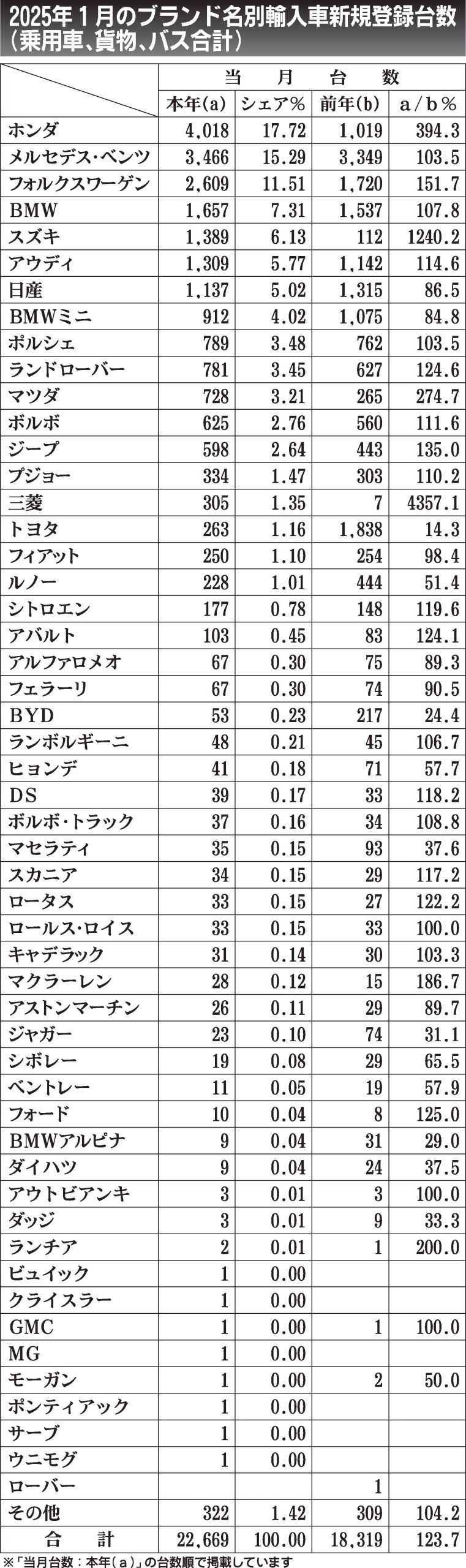 〈2025年1月のブランド名別輸入車新規登録台数(乗用車、貨物、バス合計)〉