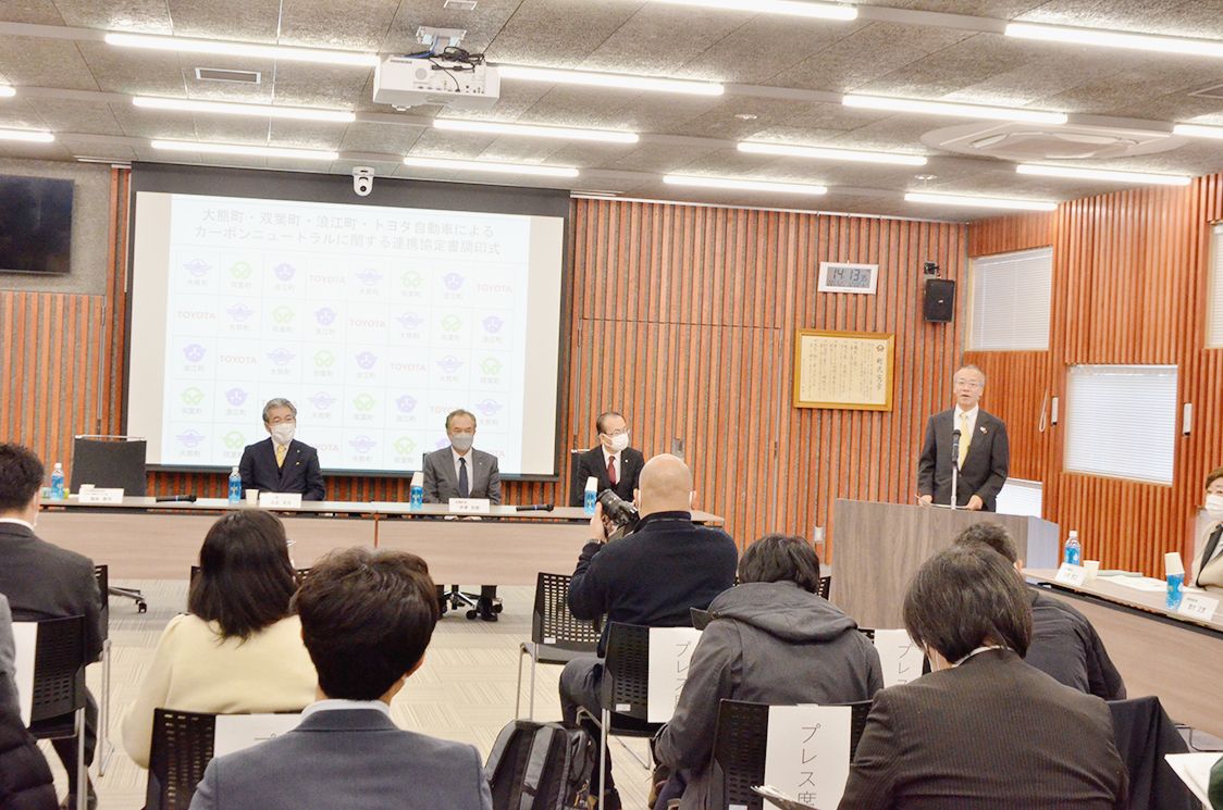 【福島】トヨタは双葉町役場で大熊町、双葉町、浪江町と「カーボンニュートラルに関する連携協定」を締結した。協定は、トヨタが保有する農業分野の知見を自治体に提供することで、酪農と飼料栽培を通じた循環型農業の実現を目指す。 トヨタは、浪江町で土...